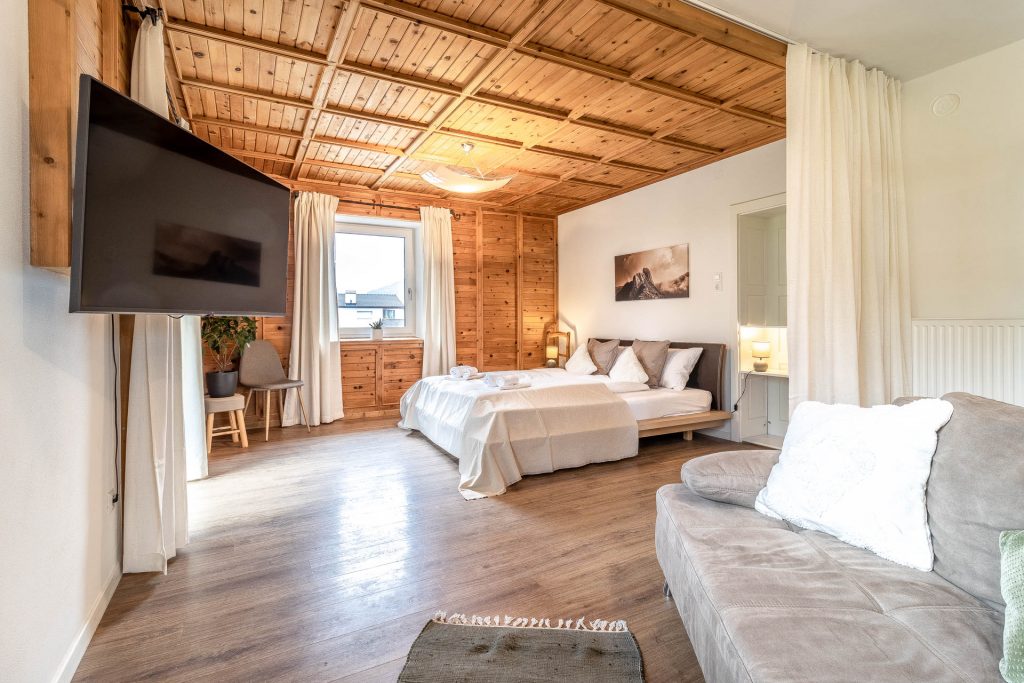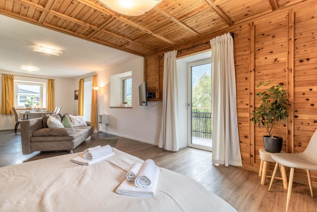 Das Hasenöhrl ist ein großzügiges Openspace-Apartment, in dem Küche, Essbereich, Wohn- und Schlafbereich in einem Raum zusammengeführt sind. Die offene Raumgestaltung schafft Weite und lässt viel Tageslicht in den Wohnbereich. Der südlich ausgerichtete, große Balkon erweitert den Wohnraum nach außen und bietet viel Platz zum Verweilen mit Blick auf den Berg Hasenöhrl und die naturbelassene Streuobstwiese.